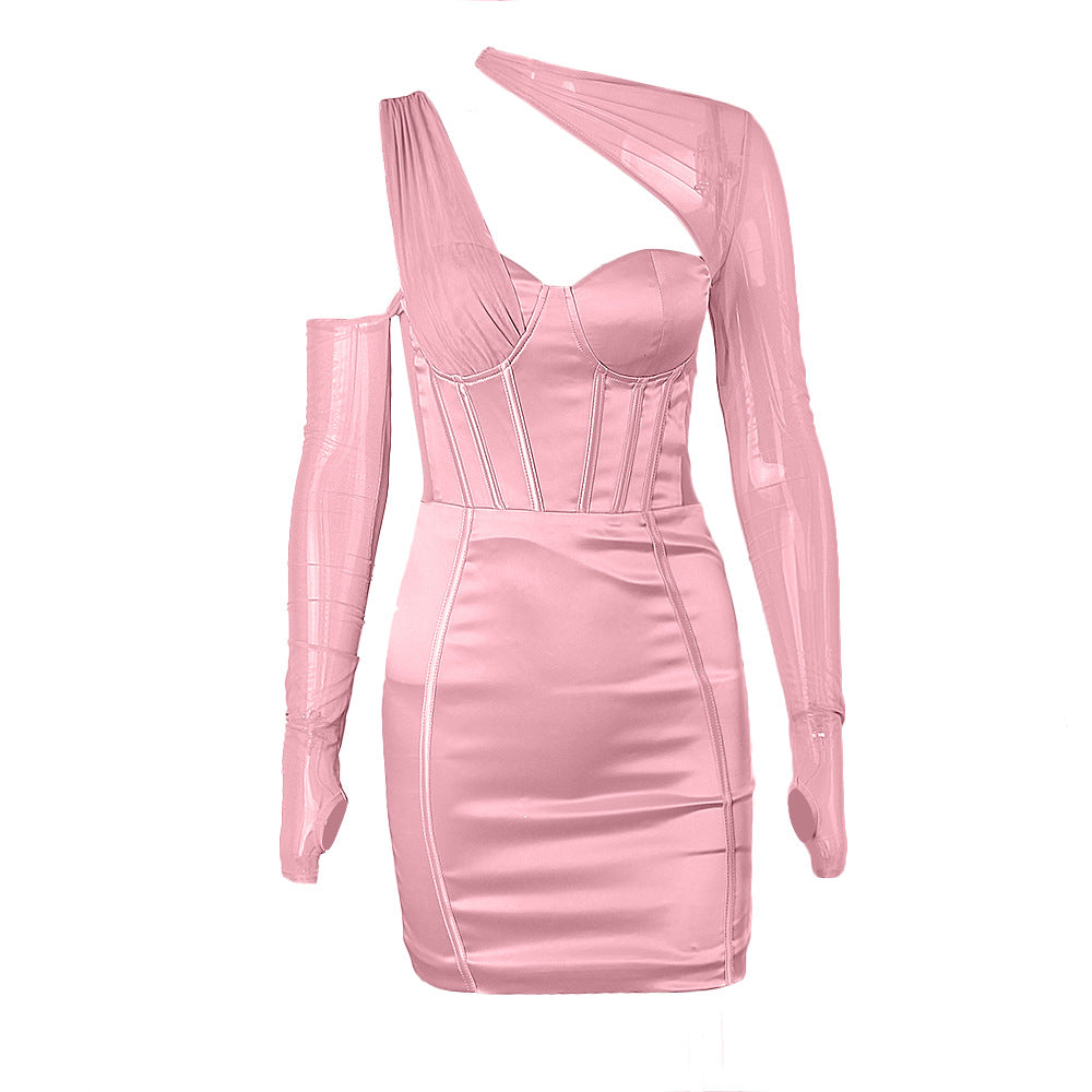 Women's Dress Diagonal Shoulder Splicing Mesh Fishbone Backless Sexy Hip Wrap Slim Dress