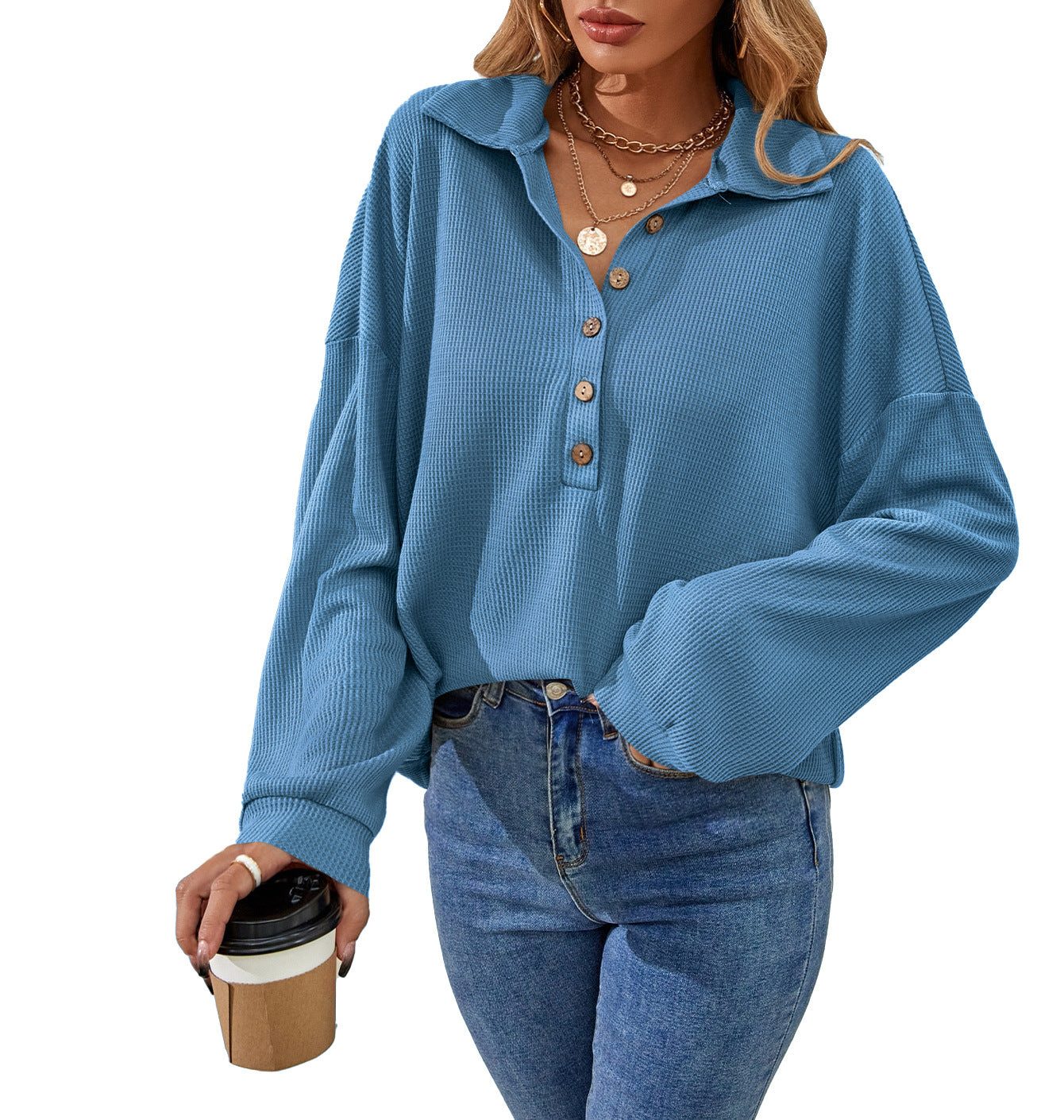 Women's New Autumn And Winter Lapel Button Solid Color Long-Sleeved Top T-Shirt
