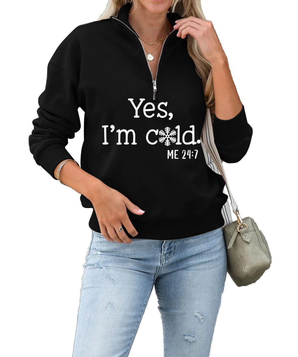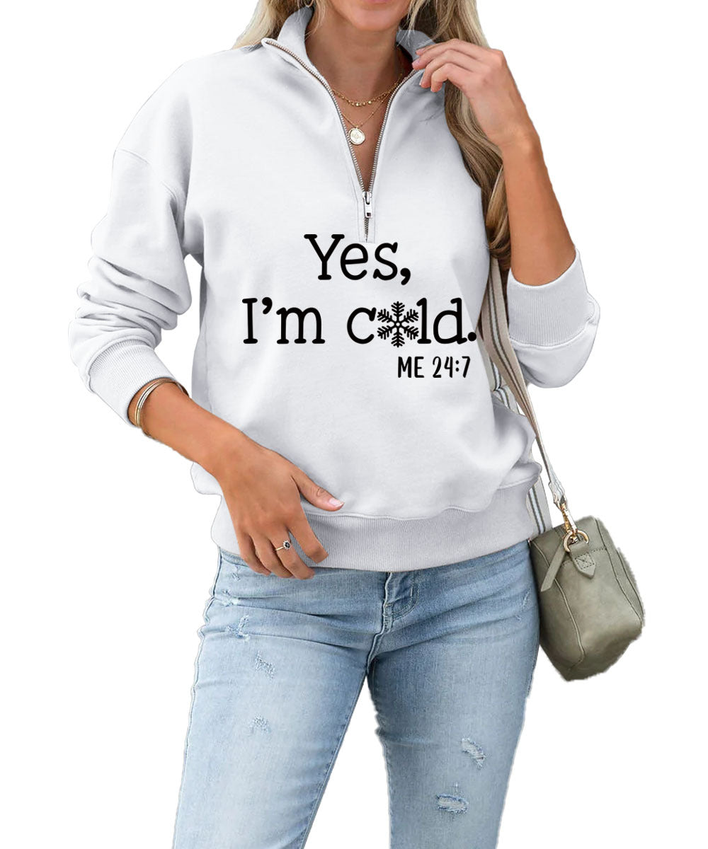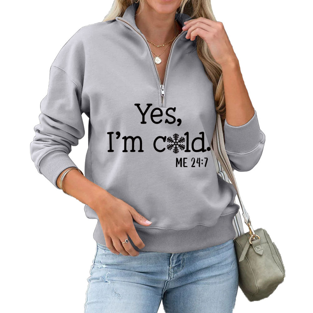 Yes I'm Cold Fashion Letter Casual Round Neck Snowflake Zipper Hoodie