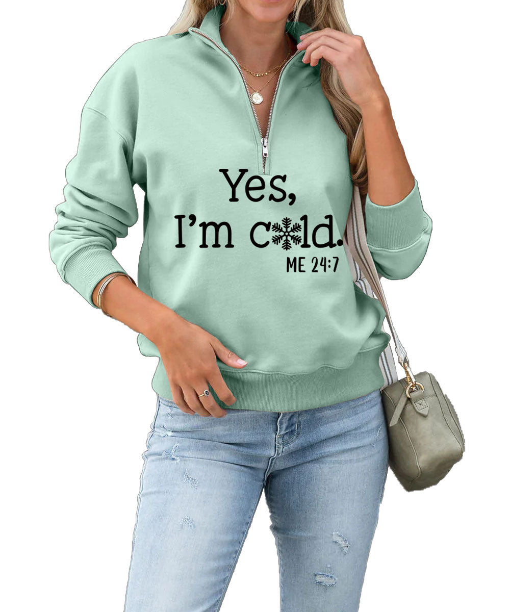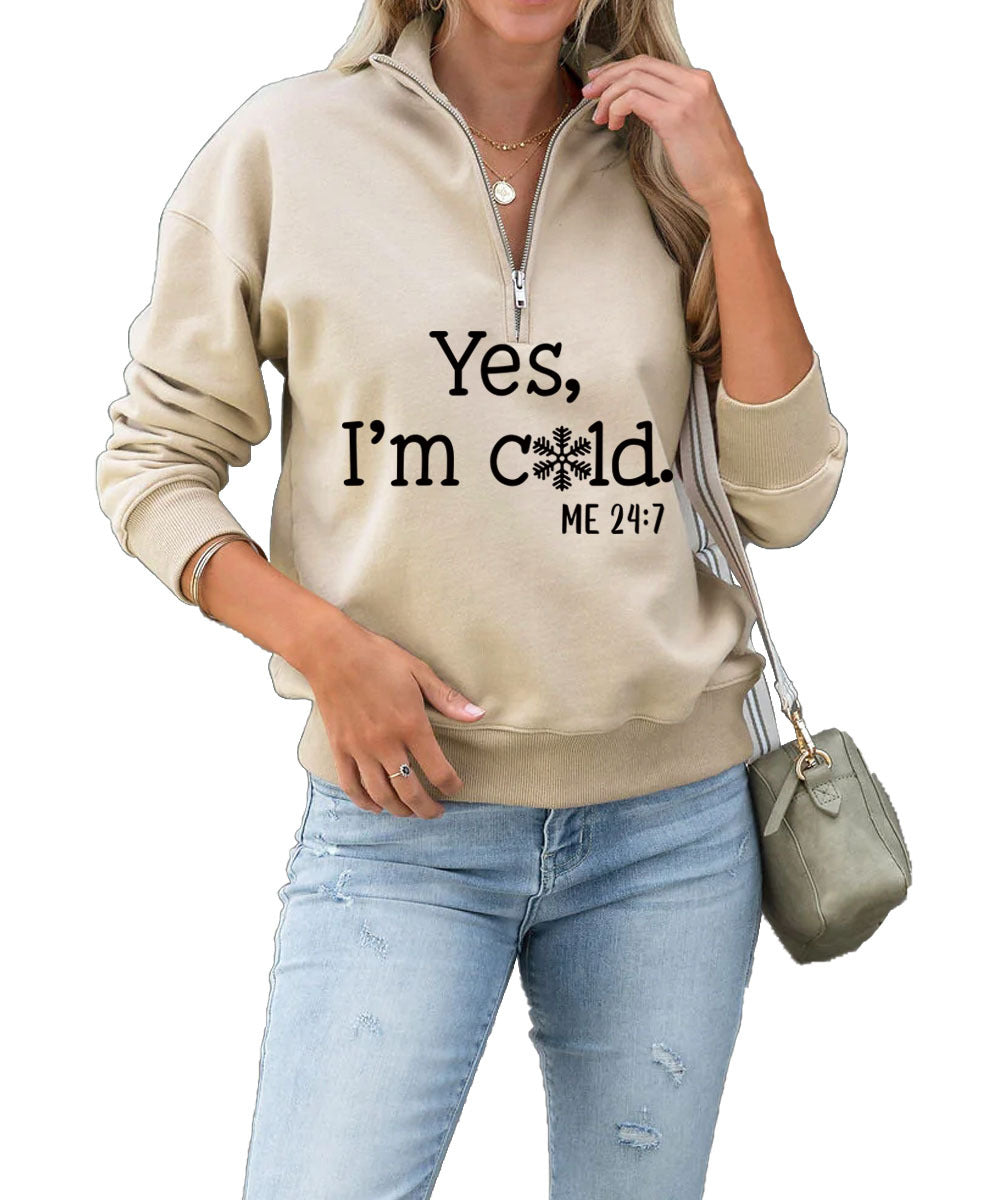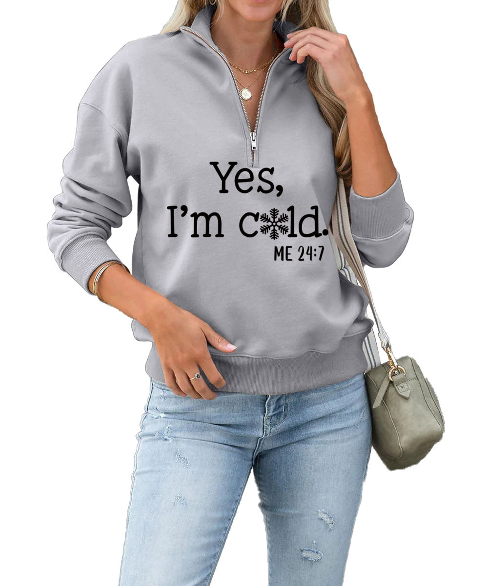 Yes I'm Cold Fashion Letter Casual Round Neck Snowflake Zipper Hoodie